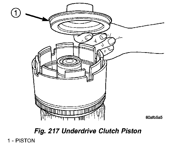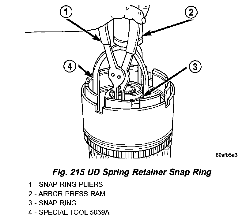 18. Using Tool 5059A and an arbor press, compress UD clutch piston enough to remove snap ring (Fig. 215) (Fig. 216).