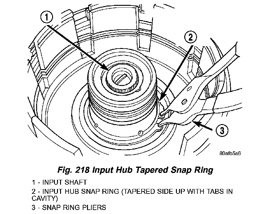22. Tap on input hub with soft faced hammer and separate input hub from OD/Reverse piston and clutch retainer (Fig. 219) (Fig. 220).