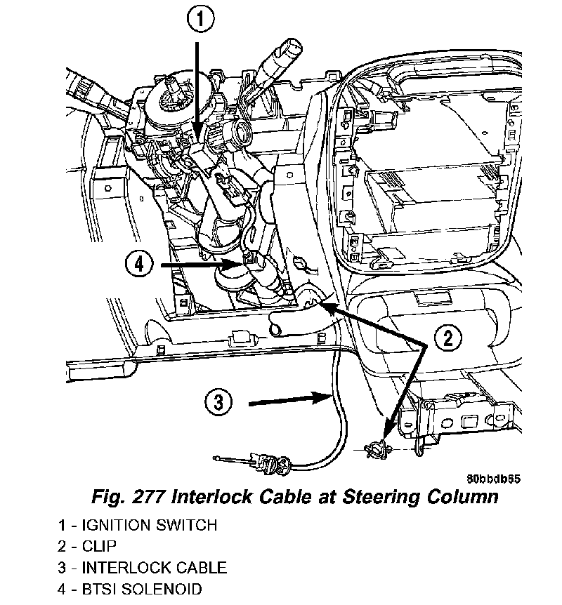 8. Disconnect the Brake Transmission Shift Interlock (BTSI) solenoid connector from the interlock cable (Fig. 277).