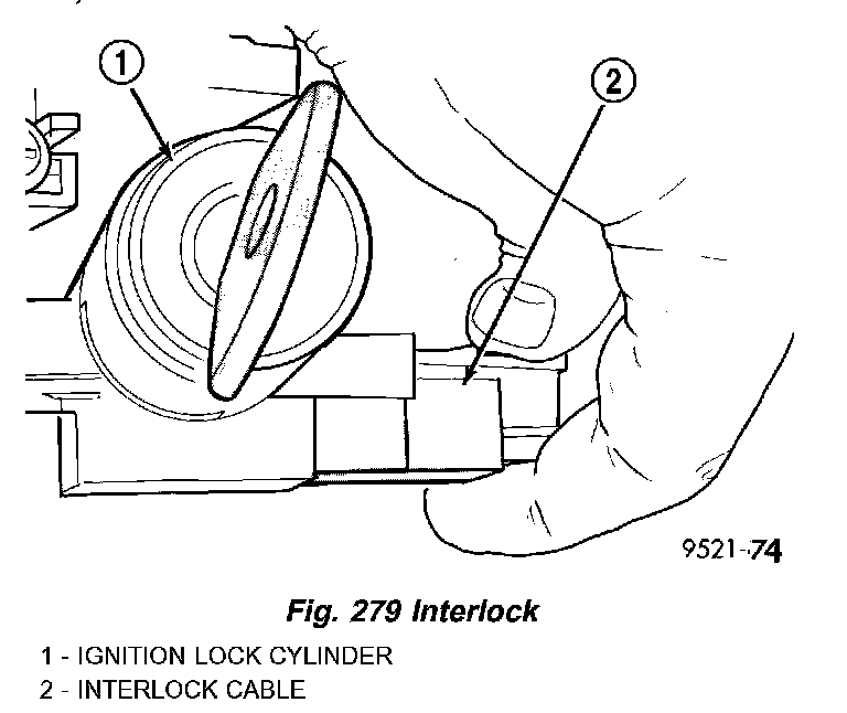 3. Install the interlock cable into the interlock housing at the steering column (Fig. 280). Verify the cable snaps into the housing and is fully seated.