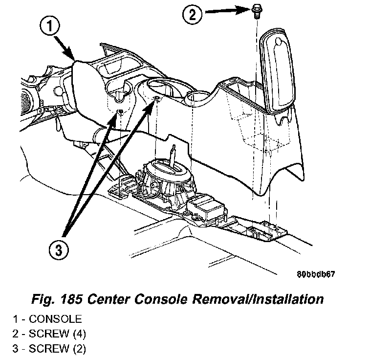 2. Remove the center console assembly as shown in (Fig. 185).