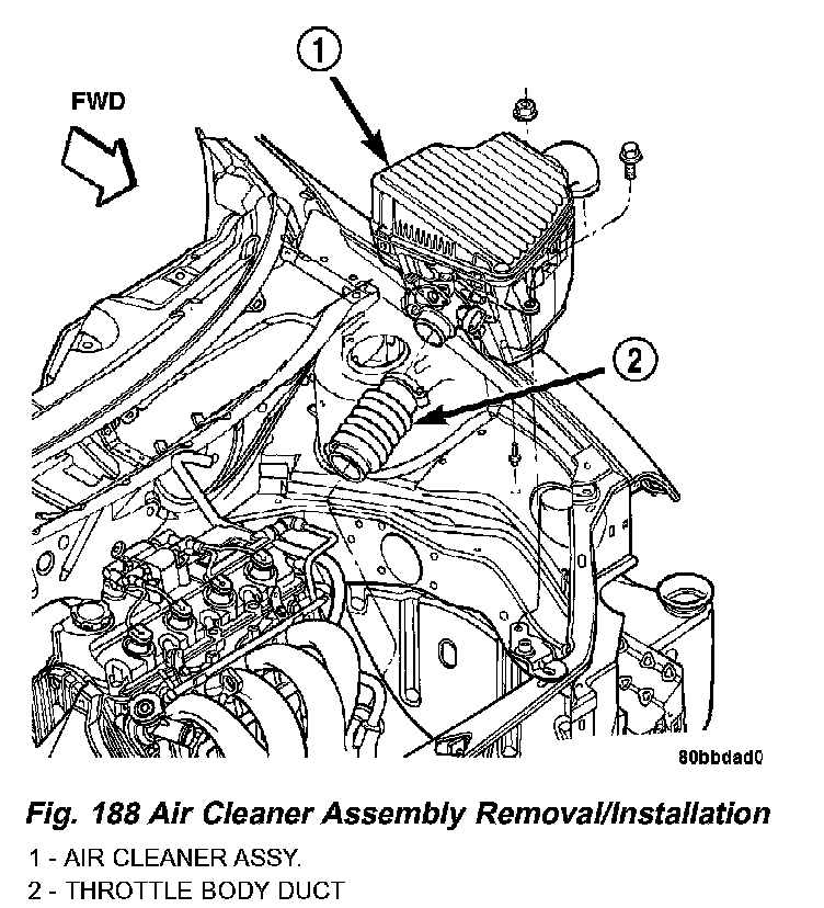 7. Remove air cleaner/throttle body assy. (Fig. 188) as follows: