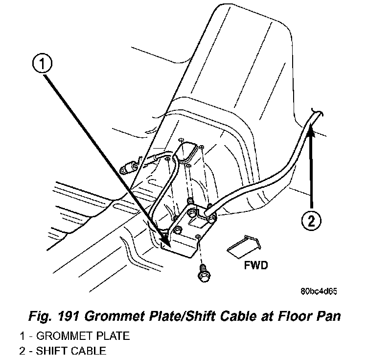 1. Install cable assembly through floor pan opening and secure to floor pan with grommet plate and one screw (Fig. 191). Make sure the three grommet plate studs protrude through cable assembly and floor pan and tighten screw to 7 Nm (60 in. lbs.).