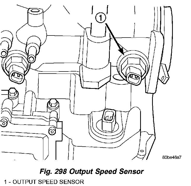 The Output Speed Sensor is a two-wire magnetic pickup device that generates an AC signal as rotation occurs. It is threaded into the transaxle case (Fig. 298), sealed with an O-ring (Fig. 299), and is considered a primary input to the Transmission Control Module (TCM).