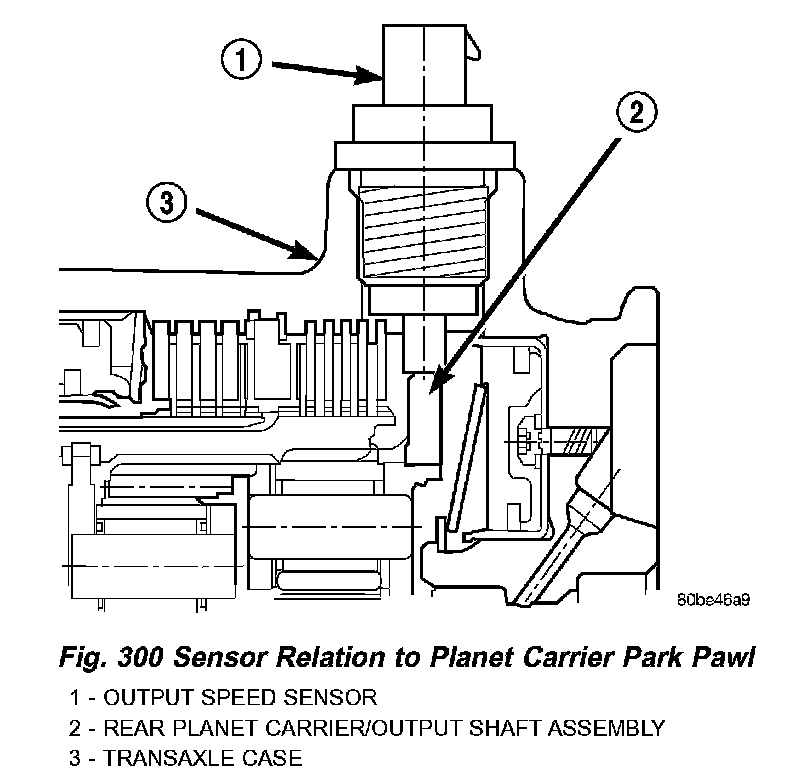 The Output Speed Sensor provides information on how fast the output shaft is rotating. As the rear planetary carrier park pawl lugs pass by the sensor coil (Fig. 300), an AC voltage is generated and sent to the TCM. The TCM interprets this information as output shaft rpm.