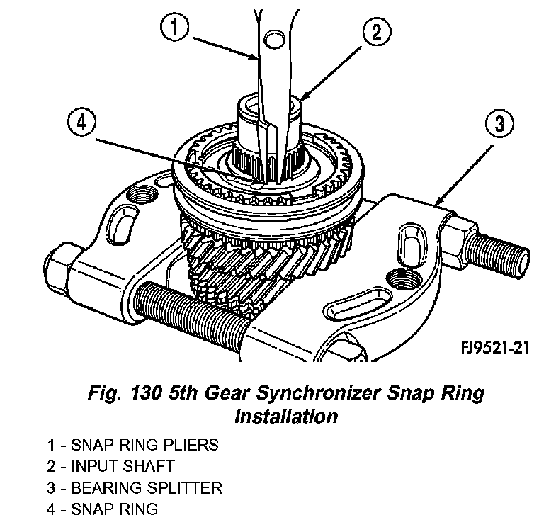 12. Install 5th gear synchronizer snap ring (Fig. 130).
