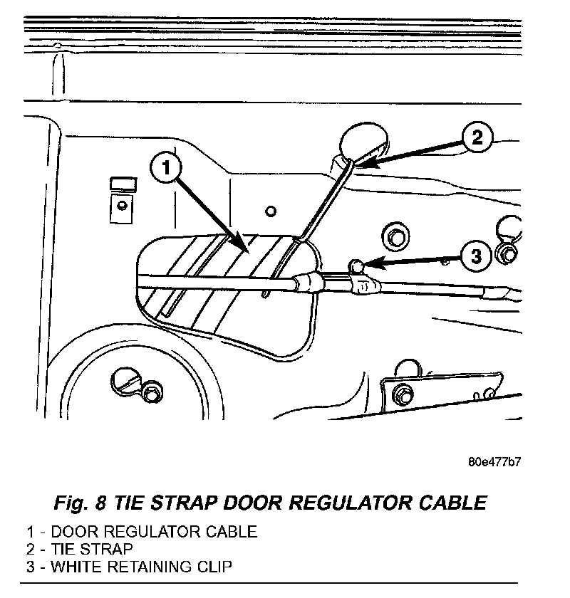 5. Install a new tie strap around the outboard regulator cable and door inner sheet metal.