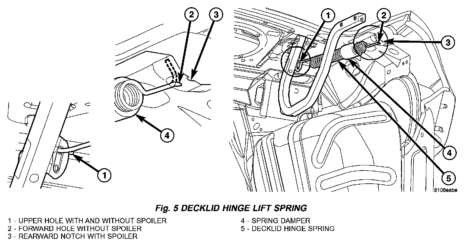 2. Using a common pliers, connect spring to the rearward notch or hole under decklid opening side trough (Fig. 5). Without spoiler connect the spring into the hole. With spoiler connect spring to the notch.