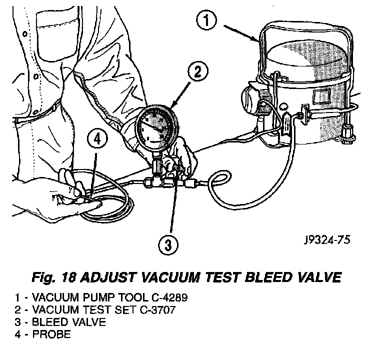 Use an adjustable vacuum test set (Special Tool C-3707-B) and a suitable vacuum pump to test the heater-A/C vacuum control system. With a finger placed over the end of the vacuum test hose probe, adjust the bleed valve on the test set gauge to obtain a vacuum of exactly 27 kPa (8 in. Hg.). Release and block the end of the probe several times to verify that the vacuum reading returns to the exact 27 kPa (8 in. Hg.) setting. Otherwise, a false reading will be obtained during testing.