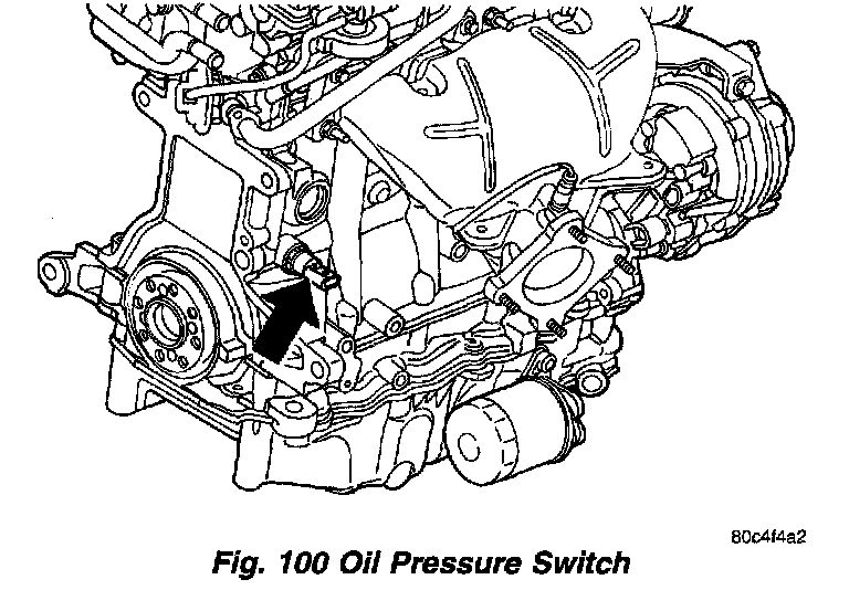The oil pressure switch is located on the right rear side of the engine block (Fig. 100). The oil pressure switch is a pressure sensitive switch that is activated by the engine's oil pressure (in the main oil gallery). The switch is a two terminal device (one terminal is provided to the wiring harness and the other terminal is the switch's metal housing that screws into the engine block).