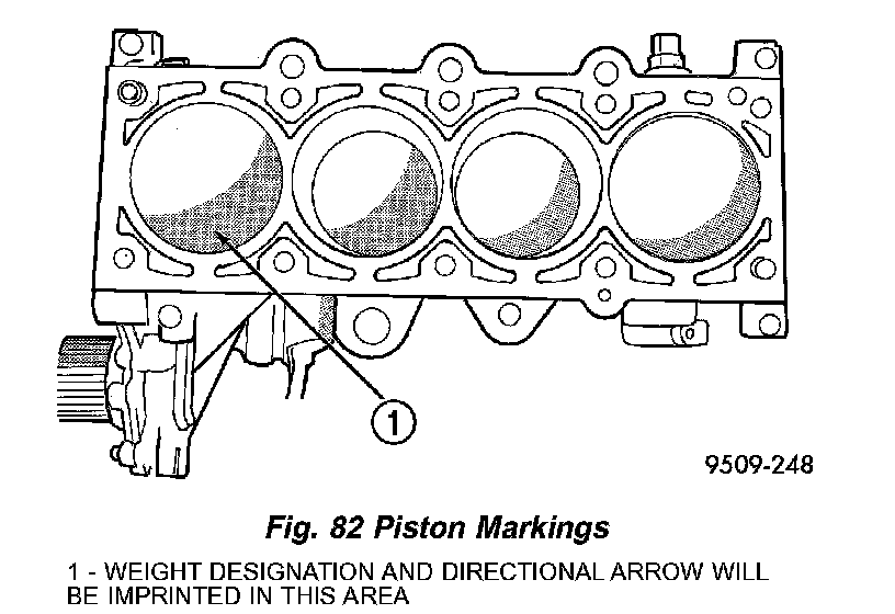 5. Pistons will have a stamping in the approximate location shown in (Fig. 82). These stamps will be either a directional arrow or a weight identification for the assembly. L is for light and H is for heavy. These assemblies should all be the same weight class. Service piston assemblies are marked with a S and can be used with either L or H production assemblies. The weight designation stamps should face toward the timing belt side of the engine.