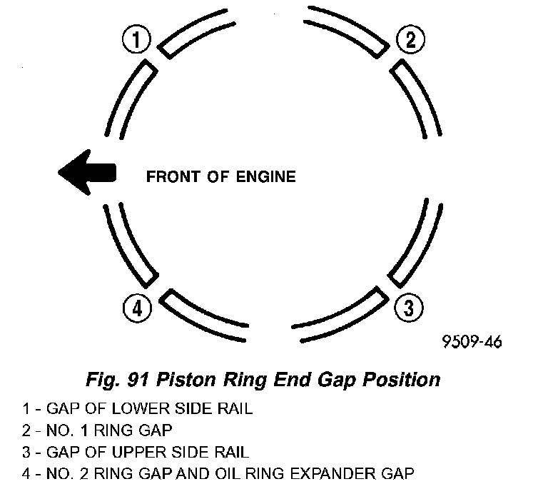 3. Before installing the ring compressor, ensure the oil ring expander ends are butted and the rail gaps are located as shown in (Fig. 91).
