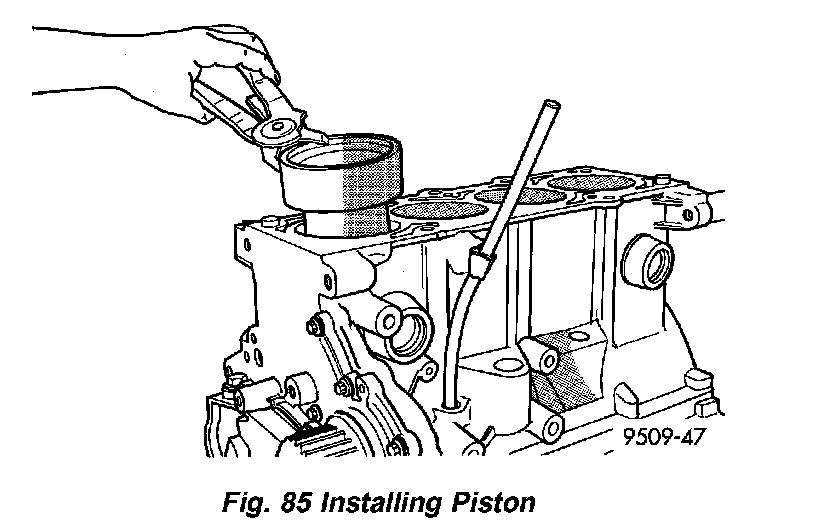 4. Immerse the piston head and rings in clean engine oil, slide the ring compressor, over the piston (Fig. 85). Be sure position of rings does not change during this operation.