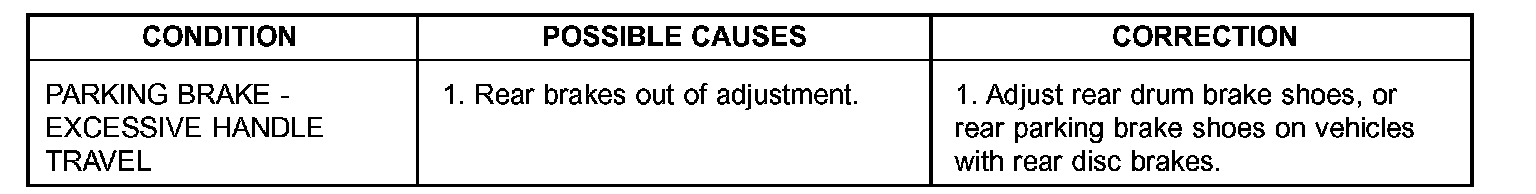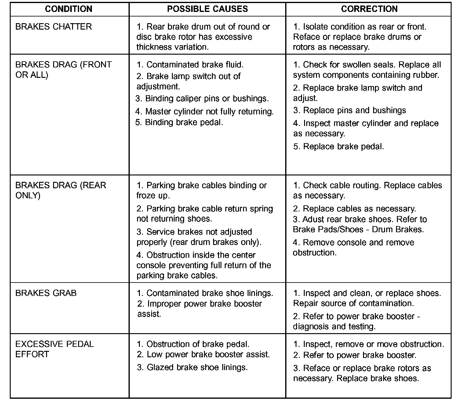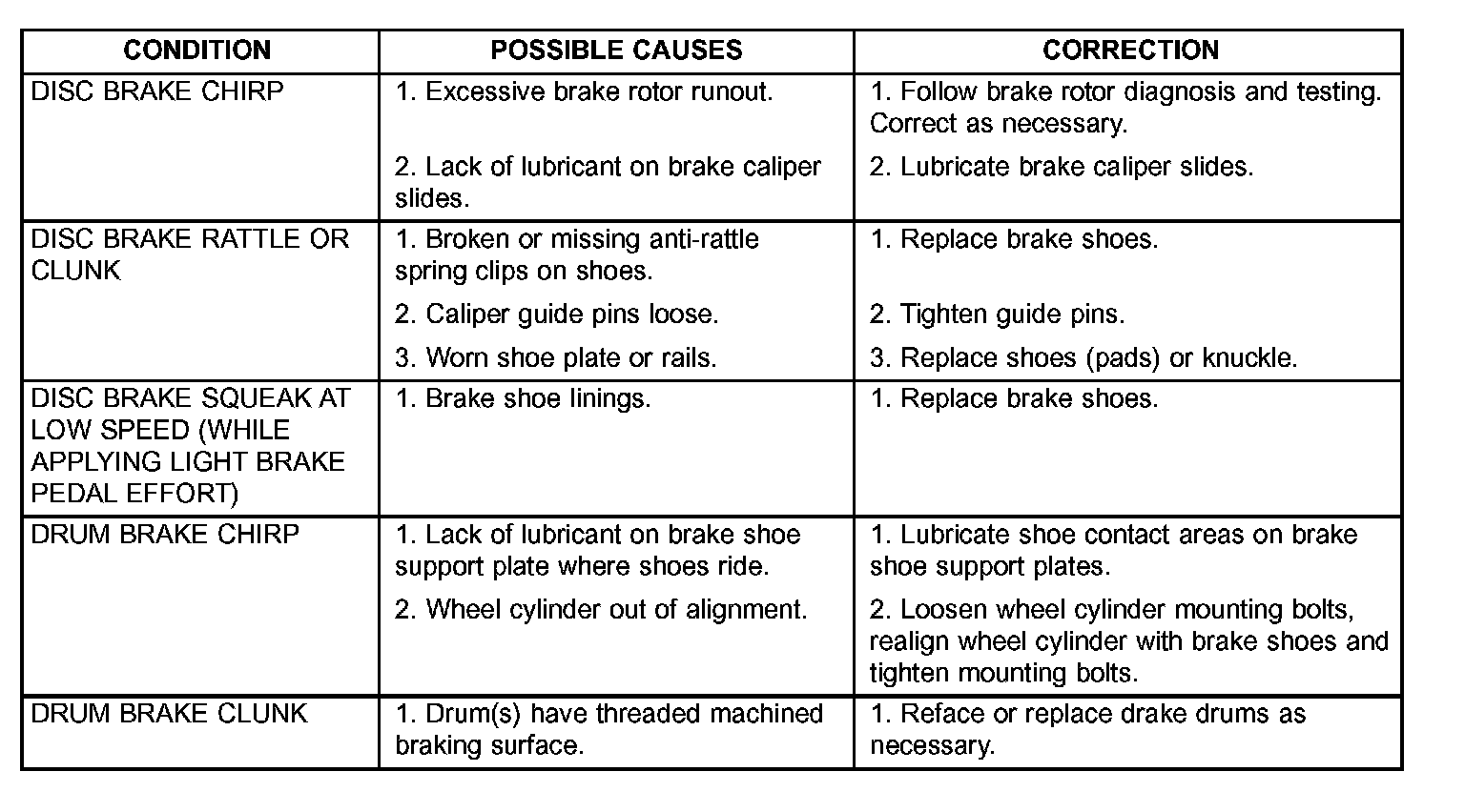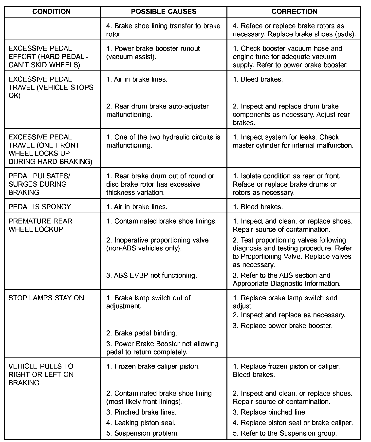 DIAGNOSIS AND TESTING - BASE BRAKE SYSTEM DIAGNOSIS CHARTSNOTE: There are three diagnosis charts shown that cover the RED BRAKE WARNING INDICATOR LAMP, BRAKE NOISE and OTHER BRAKE CONDITIONS.