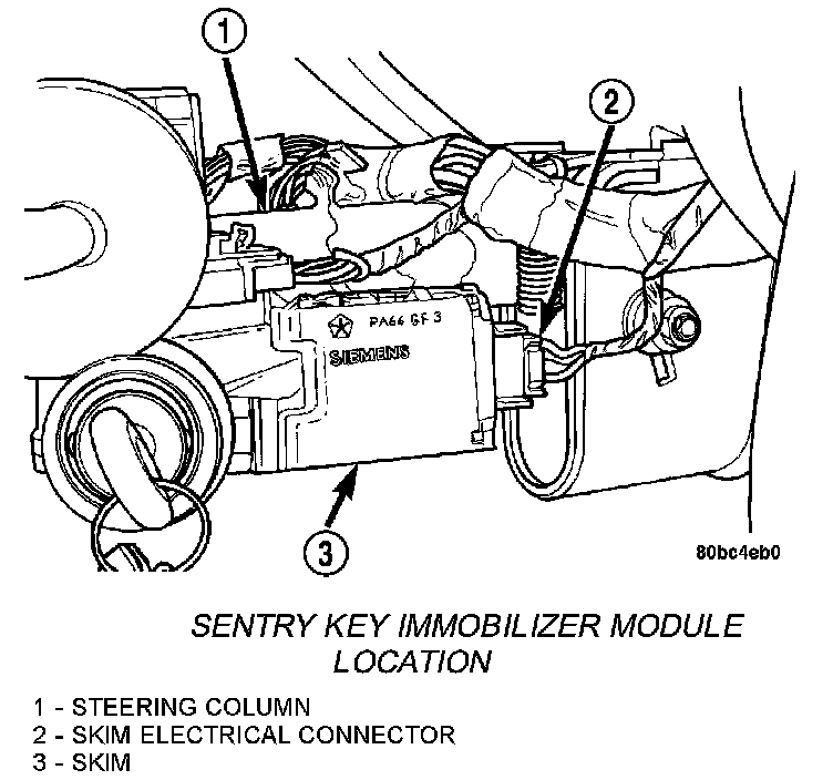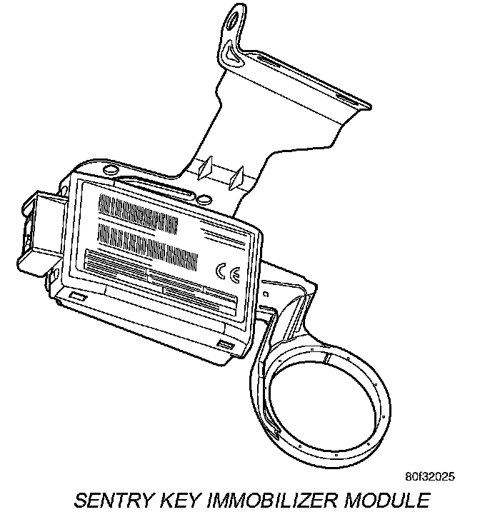 The Sentry Key Immobilizer Module (SKIM) contains a Radio Frequency (RF) transceiver and a microprocessor. The SKIM retains in memory the ID numbers of any Sentry Key that is programmed to it. The maximum number of keys that may be programmed to each module is eight 8. The SKIM also communicates over the PCI bus with the Powertrain Control Module (PCM), the instrument cluster, and the DRB III(R) scan tool. The SKIM transmits and receives RF signals through a tuned antenna enclosed within a molded plastic ring formation that is integral to the SKIM housing. When the SKIM is properly installed on the steering column, the antenna ring fits snugly around the circumference of the ignition lock cylinder housing. If this ring is not mounted properly, communication problems may arise in the form of transponder-related faults.