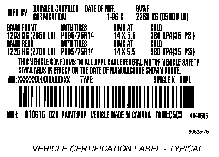 A vehicle certification label is attached to the rear surface of the driver's door. This label indicates date of manufacture (month and year), Gross Vehicle Weight Rating (GVWR), Gross Axle Weight Rating (GAWR) front, Gross Axle Weight Rating (GAWR) rear and the Vehicle Identification Number (VIN). The Month, Day and Hour of manufacture is also included.
