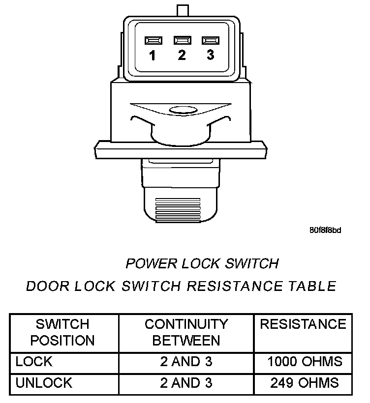 2. Using an ohmmeter, refer to the resistance table to determine if switch resistance is correct in the Lock and Unlock switch positions.