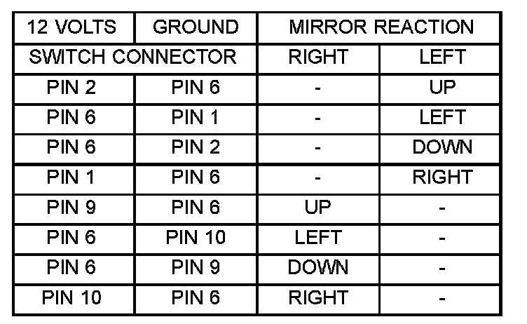 - Refer to the Mirror Motor Test Chart for proper wire connections at the switch connector.