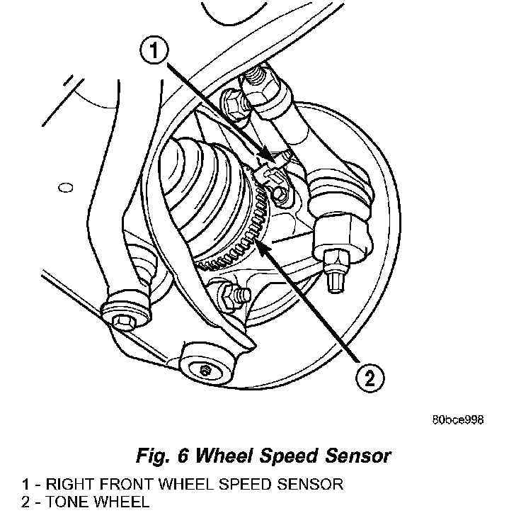 5. Remove the bolt mounting the wheel speed sensor head to the steering knuckle (Fig. 6).