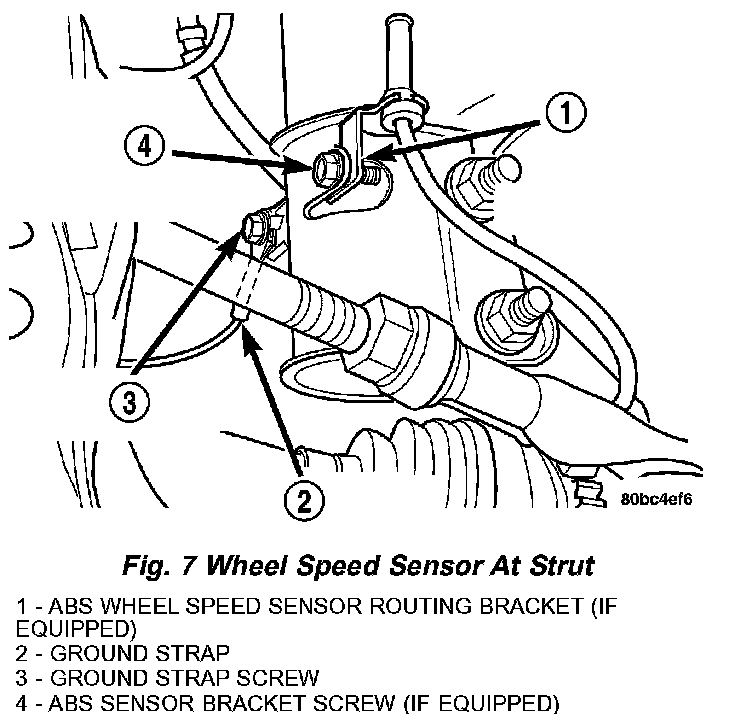 7. Remove the screw securing the wheel speed sensor to the rear of the strut (Fig. 7). Remove the wheel speed sensor.