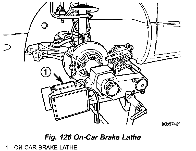 If the rotor surface is deeply scored or warped, or there is a complaint of brake roughness or brake pedal pulsation, the rotor should be refaced using a hub-mounted on-car brake lathe (Fig. 126), or replaced.
