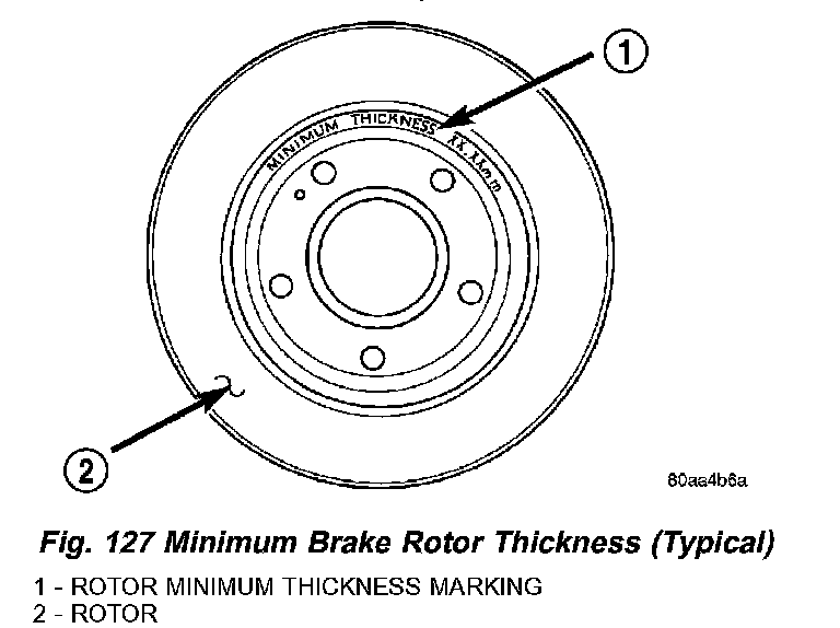 NOTE: All rotors have markings for minimum allowable thickness cast on an unmachined surface of the rotor (Fig. 127) or stamped into the hat section. Minimum thickness specifications can also be found in the specification table in this section.