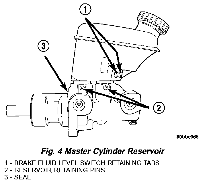 1. Remove the vehicle wiring harness connector from brake fluid level switch in master cylinder brake fluid reservoir (Fig. 3).