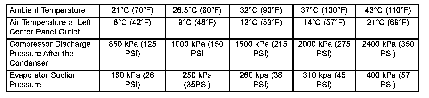 6. With the A/C clutch engaged, compare the discharge air temperature to the A/C Performance Temperatures charts.