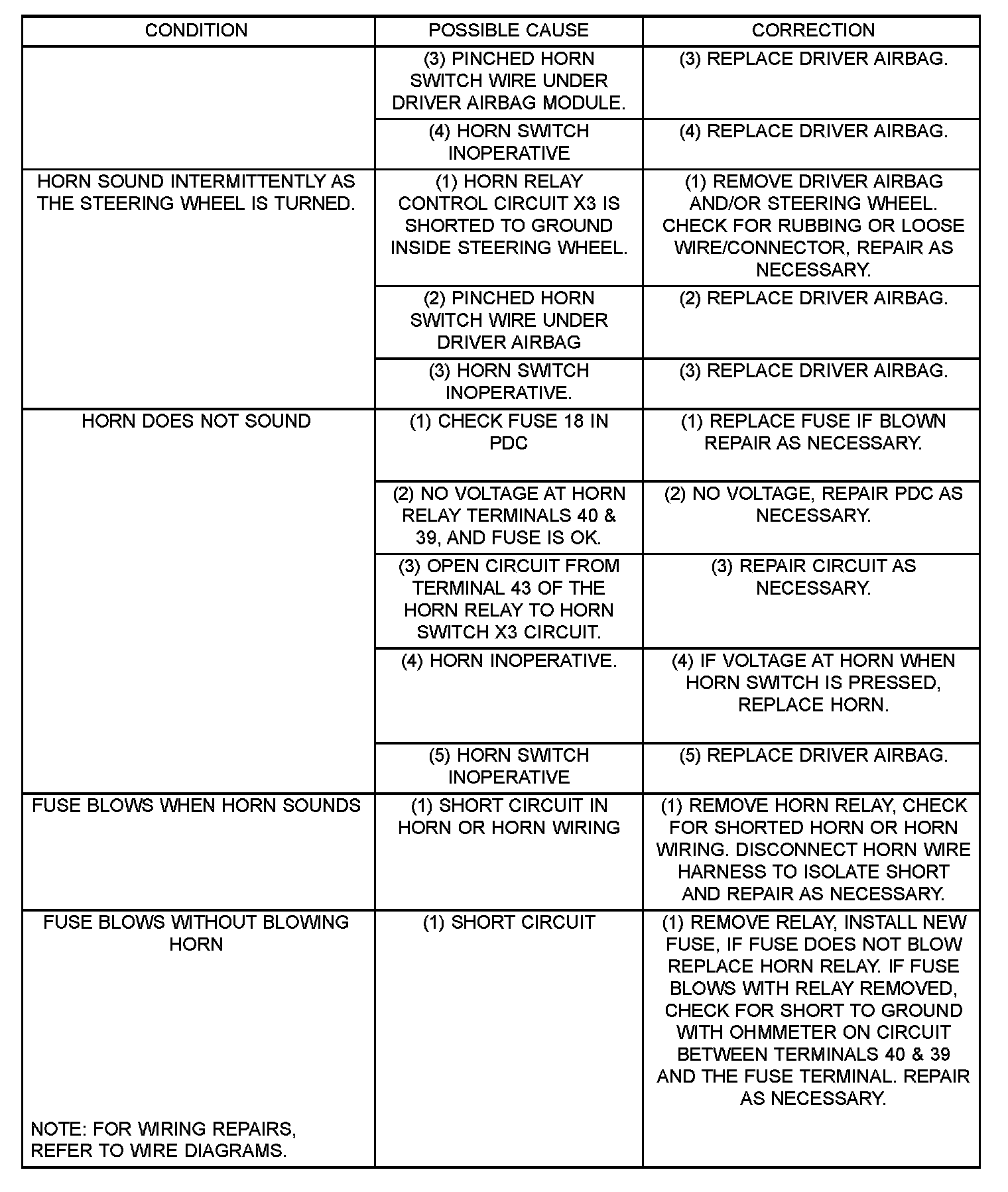 Refer to Horn System Test table. If the horn does not sound, check the horn fuse located in the Power Distribution Center. If the fuse is blown, replace with the correct fuse. If the horn fails to sound and the new fuse blows when depressing the horn switch, a - short circuit in the horn or the horn wiring between s the fuse terminal and the horn is responsible, or a defective horn switch allowed the horn to burn out is responsible.