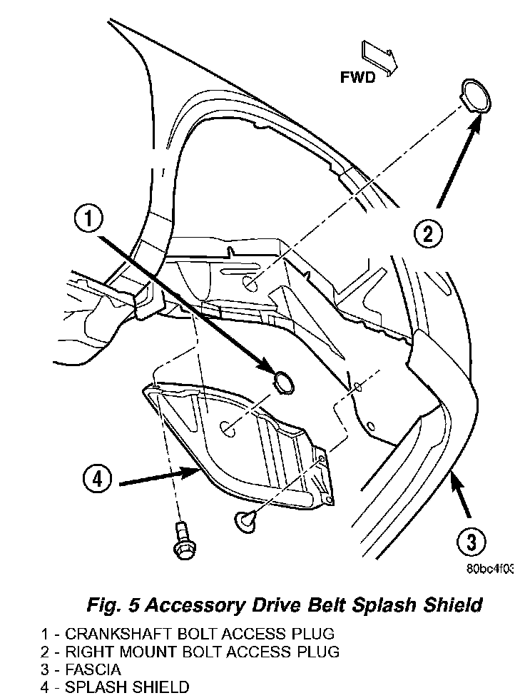 4. Remove accessory drive belt splash shield (Fig. 5).