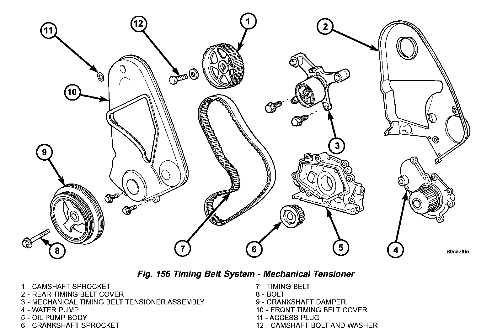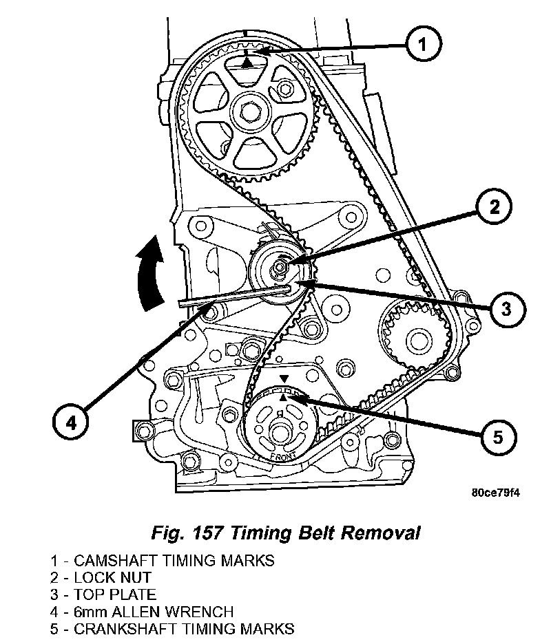 4. Insert a 6 mm Allen wrench into the hexagon opening located on the top plate of the belt tensioner pulley. Rotate the top plate CLOCKWISE until there is enough slack in timing belt to allow for removal (Fig. 157).