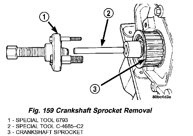 2. Remove the crankshaft sprocket using Special Tool 6793 and insert C-4685-C2 (Fig. 159).