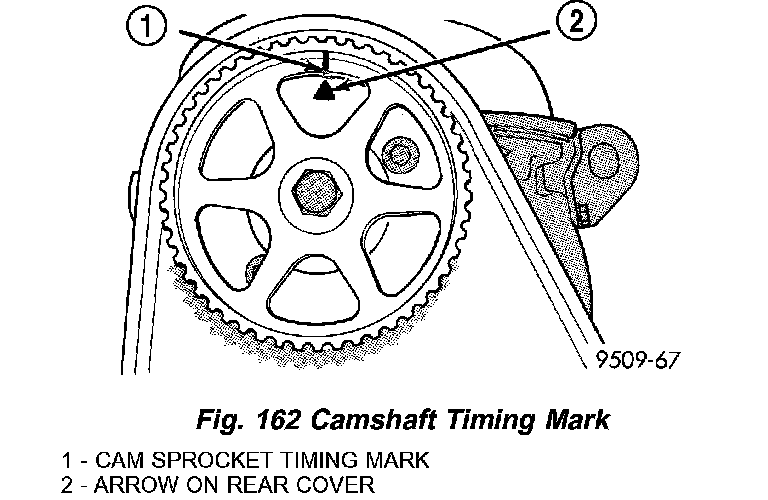 2. Set camshaft to TDC by aligning mark on sprocket with the arrow on the rear timing belt cover (Fig. 162).