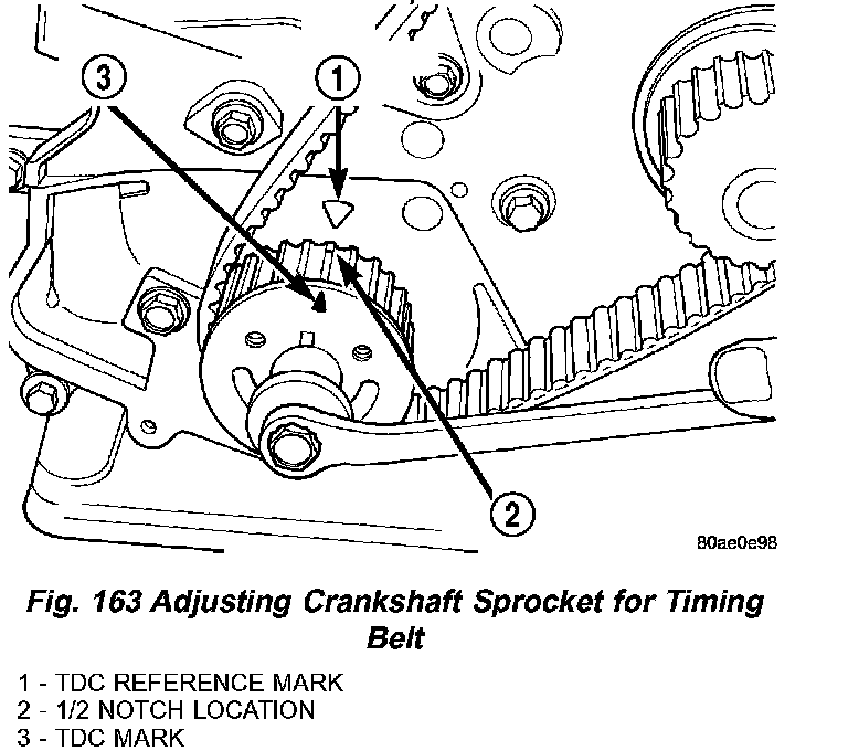 3. Move crankshaft to 1/2 mark before TDC (Fig. 163) for belt installation.