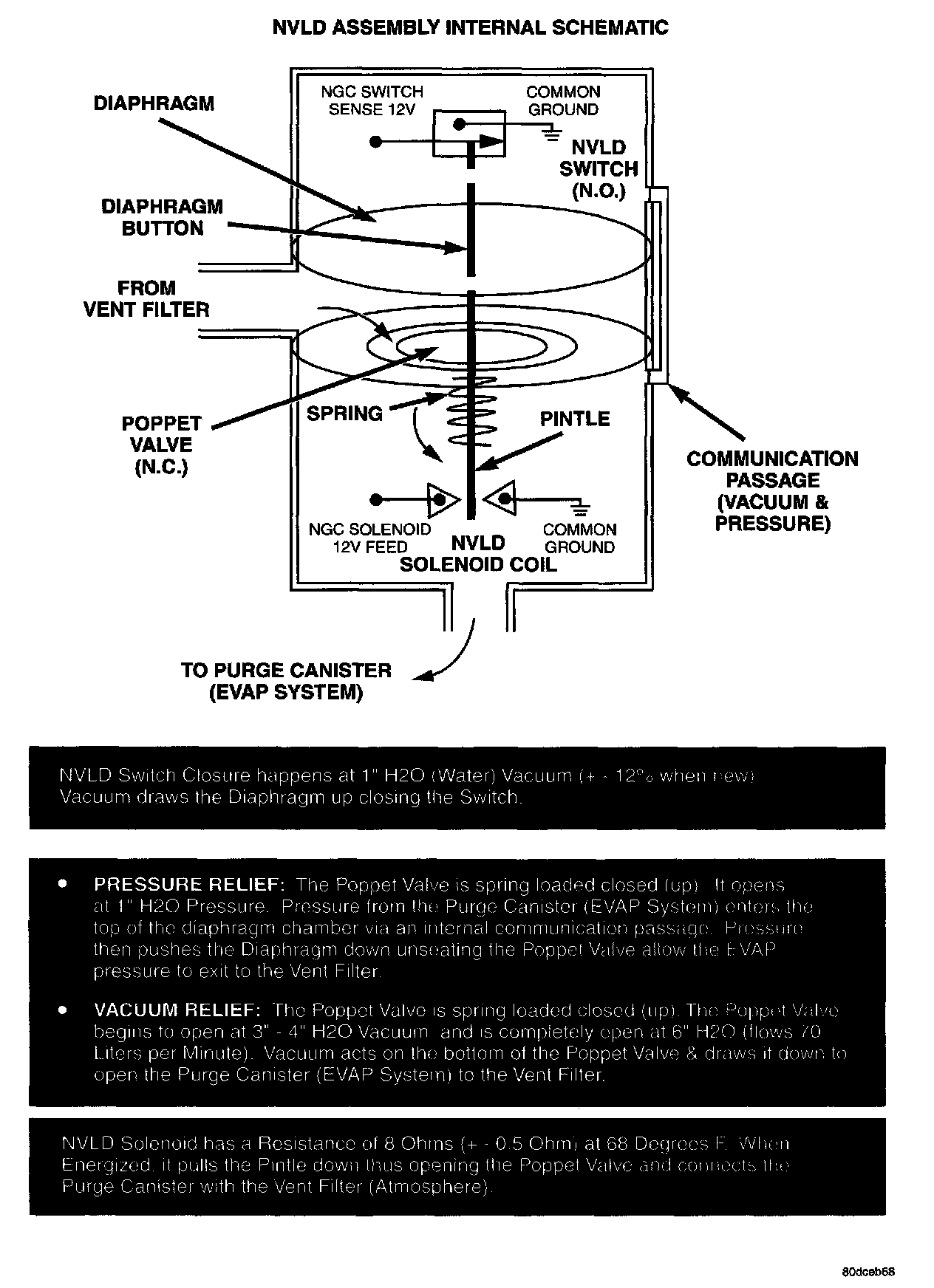 The normally closed valve in the NVLD is intended to maintain the seal on the evaporative system during the engine off condition. If vacuum in the evaporative system exceeds 3 inches to 6 inches H20 (0.75 to 1.5kPa), the valve will be pulled off the seat, opening the seal. This will protect the system from excessive vacuum as well as allowing sufficient purge flow in the event that the solenoid was to become inoperative. The solenoid actuates the valve to unseal the canister vent while the engine is running. It also will be used to close the vent during the medium and large leak tests and during the purge flow check. This solenoid requires initial 1.5 amps of current to pull the valve open but after 100 ms. will be duty cycled down to an average of about 150 mA for the remainder of the drive cycle.