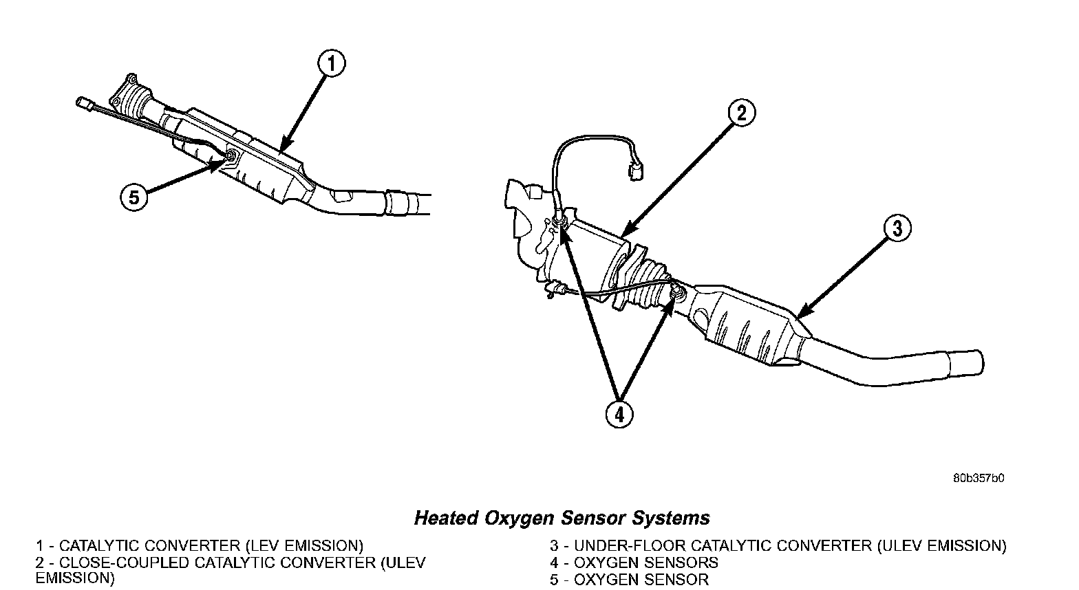 The downstream heated oxygen sensor threads into the system depending on emission package. Federal package the O2s is mounted after the catalytic converter, LEV package the O2s is mounted mid catalytic converter, ULEV package is mounted between the catalytic converter.