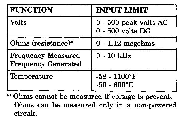 - Choose the proper range and function for the measurement. Do not try voltage or current measurements that may exceed the rated capacity. Do not exceed the limits shown in the table below: