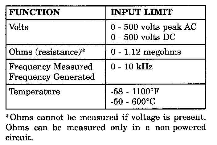 *Ohms cannot be measured if voltage is present. Ohms can be measured only in a non-powered circuit.