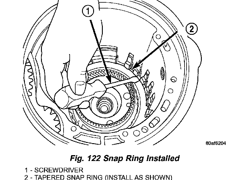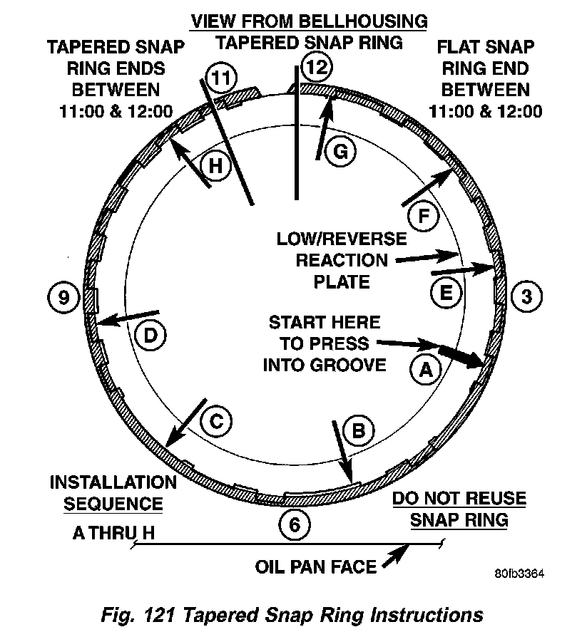42. Install tapered snap ring (with tapered side up) as shown in (Fig. 121) (Fig. 122).