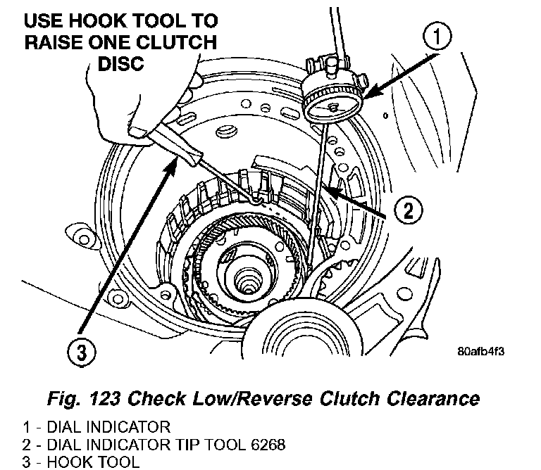 43. Set up dial indicator as shown in (Fig. 123) to measure low/reverse clutch clearance. Press down on clutch pack with finger and zero dial indicator. Low/Reverse clutch pack clearance is 0.89 - 1.47 mm (0.035 - 0.058 inch). Set up indicator and record measurement in four (4) places. Take average of readings and select the proper low/reverse reaction plate to achieve specifications.