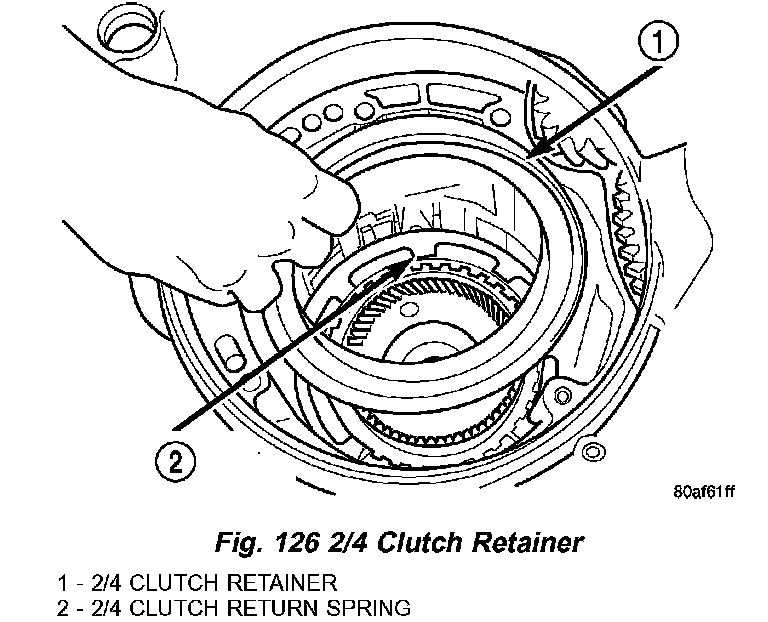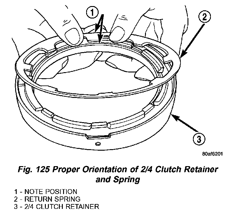 45. Orient 2/4 clutch return spring to retainer as shown in (Fig. 125), and install to transaxle (Fig. 126).