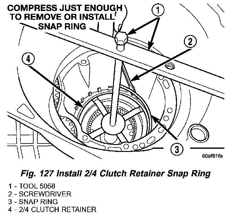 46. Using tool 5058, compress 2/4 clutch return spring just enough to install snap ring (Fig. 127).