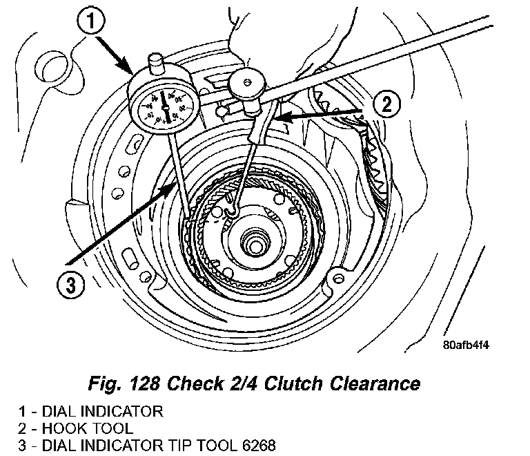 48. Set up dial indicator as shown in (Fig. 128) and measure 2/4 clutch clearance. Press down on clutch pack with finger and zero dial indicator. 2/4 clutch pack clearance is 0.76 - 2.64 mm (0.030 - 0.104 inch). Set up indicator and record measurement in four (4) places. Take average of readings. If clearance is outside this range, the clutch is assembled improperly. There is no adjustment for 2/4 clutch clearance.