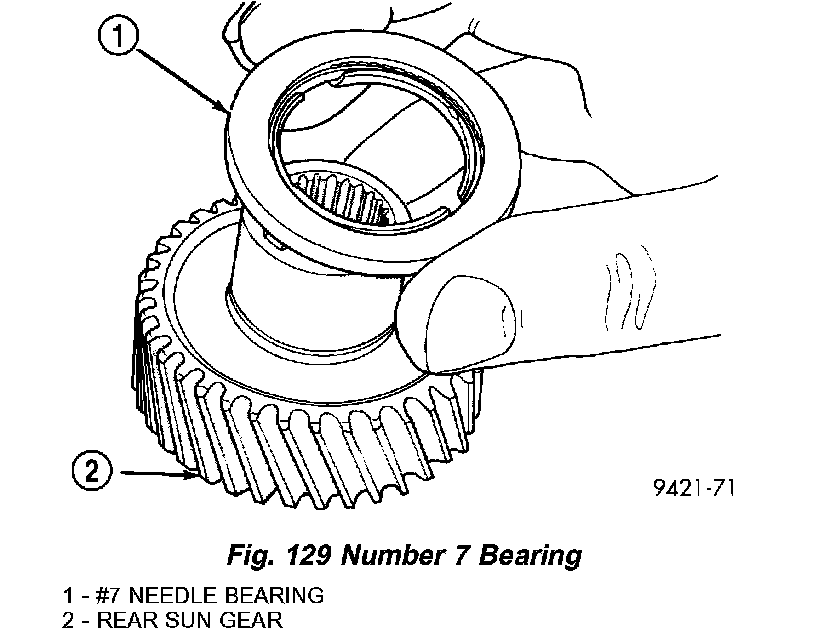 NOTE: The number seven needle bearing has three anti-reversal tabs and is common with the number five and number two position. The orientation should allow the bearing to seat flat against the rear sun gear (Fig. 129). A small amount of petrolatum can be used to hold the bearing to the rear sun gear.