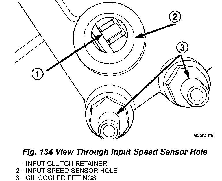 b. Install input clutch assembly into position and verify that it is completely seated by viewing through input speed sensor hole. If view through input speed sensor hole is not as shown in (Fig. 134), the input clutch assembly is not seated properly.