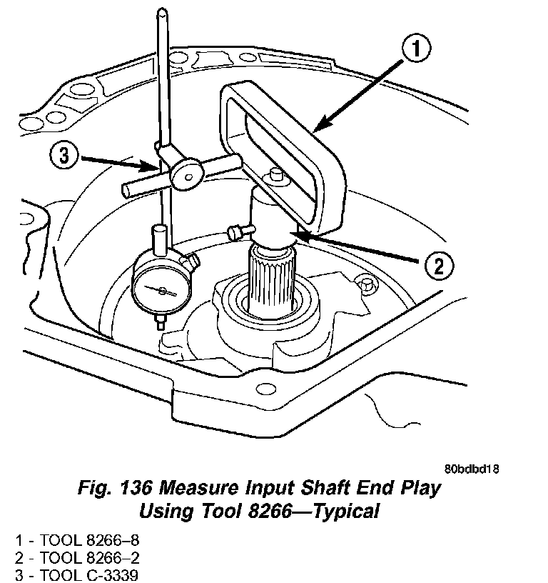e. Set up input shaft for measurement with Indicator Set C3339 and End Play Set 8266 as shown in (Fig. 136).