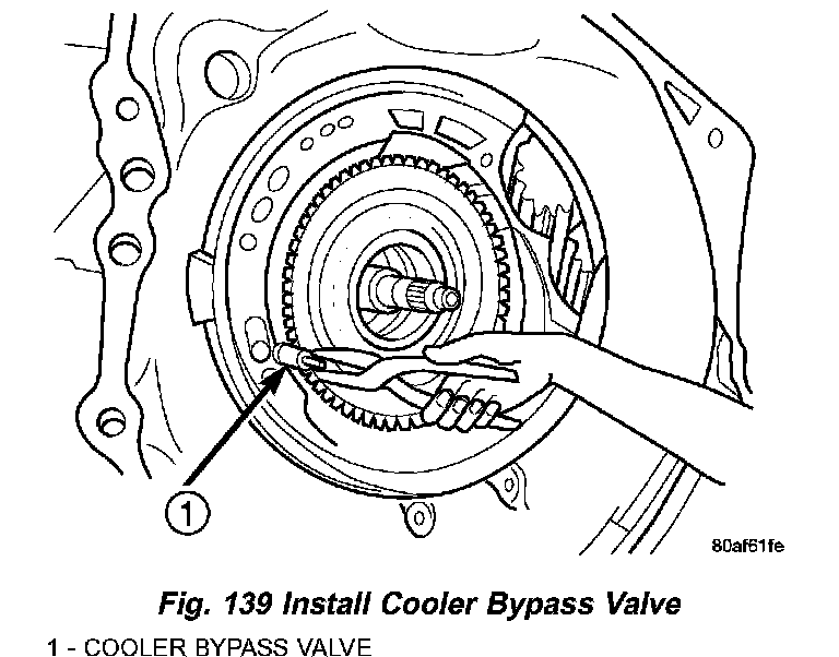 55. Install cooler bypass valve with O-ring end towards rear of case (Fig. 139).