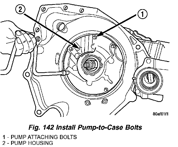 58. Install oil pump-to-case bolts and torque to 27 Nm (20 ft. lbs.) (Fig. 142).