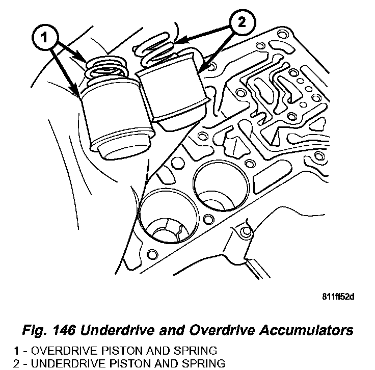 62. Install underdrive and overdrive accumulators and springs (Fig. 146).