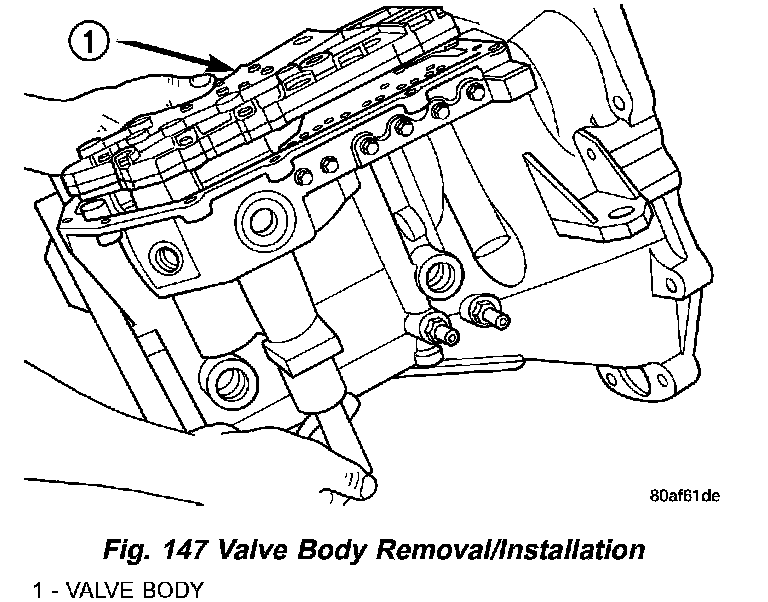 63. Install valve body to transaxle (Fig. 147). Rotate manual valve shaft fully clockwise to ease installation. Make sure park rod rollers are positioned within park guide bracket.